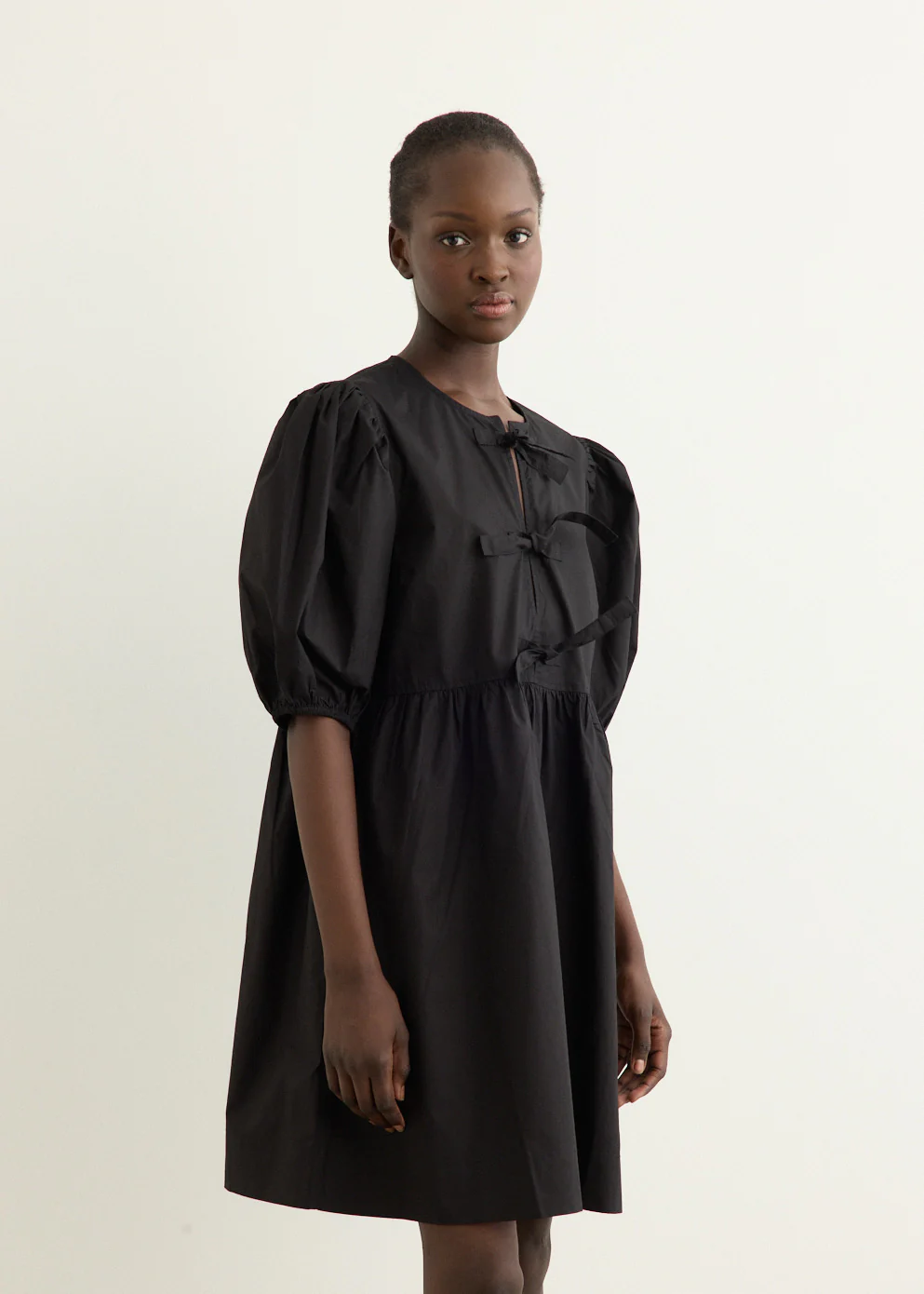 Danish label Ganni blends streetwear trends with a playful touch of humour through bold prints and colour palettes, voluminous silhouettes and easy-to-wear fabrics. The Cotton Poplin Tie String Mini Dress features a mini-length cut, along with front ties and short puffed sleeves for a timeless and on-brand look.
