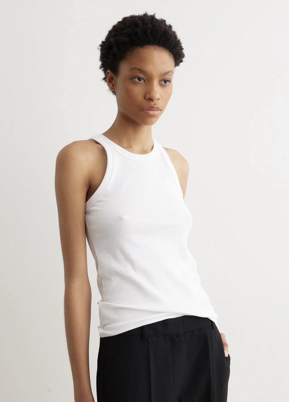 Founded in 2014 by Elin Kling and Karl Lindman, Toteme is a Stockholm-based brand renowned for crafting elevated essentials and timeless wardrobe foundations. The Curved Rib Tank is a premium staple from the brand. Crafted from organic cotton, it features a high-rounded neckline and curved seams, creating a flattering shape around the collar bones and shoulders
