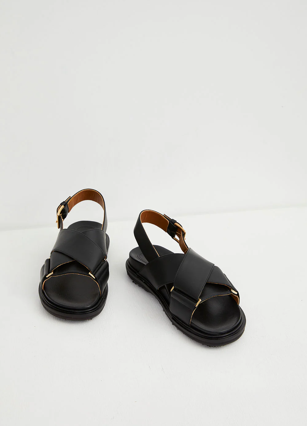 Made in Italy from supple calfskin leather, the Fussbett Sandal from Marni makes a subtle statement. With a chunky silhouette and moulded footbed, the black sandals feature a cross-over vamp design with gold-toned detailing and an adjustable buckle ankle strap.